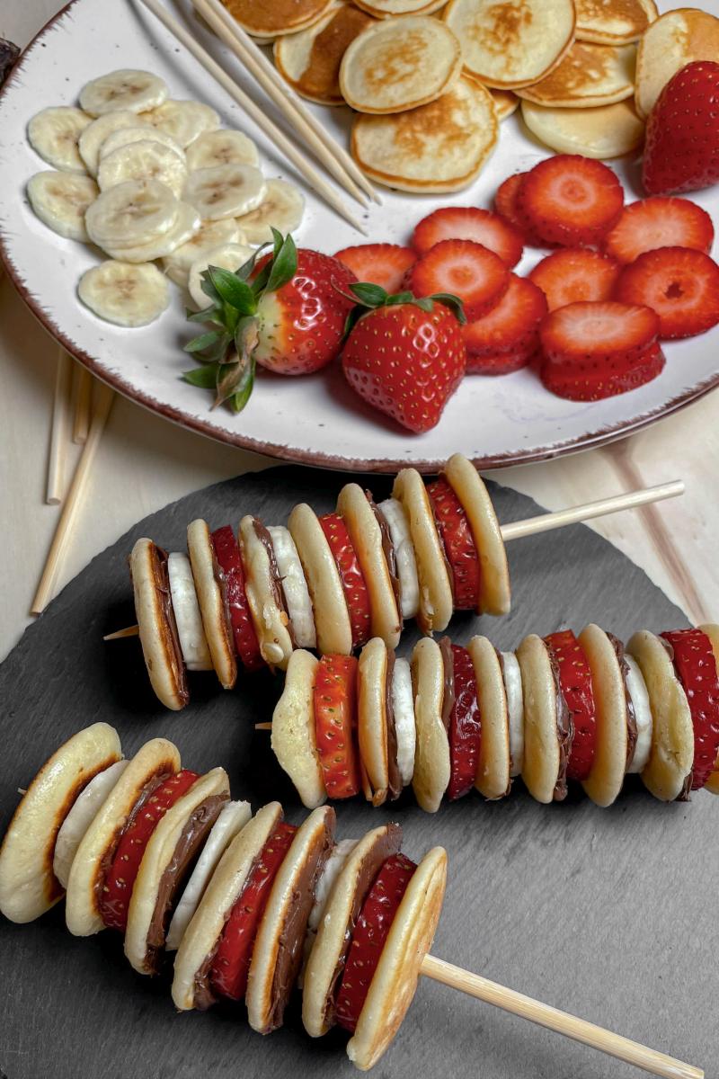 - Pancakes mit etwas Schokocreme bestreichen und abwechselnd mit Erdbeeren und Bananen auf Holzspieße stecken (ca. 7 Pancakes pro Spieß).