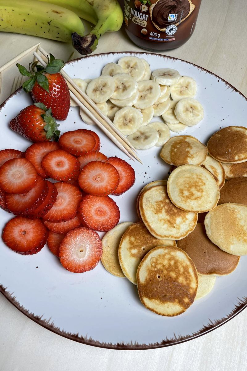 Mini Pancake Spieße mit Erdbeeren, Banane, Schoko