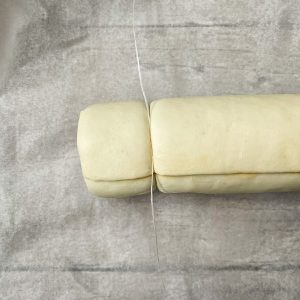 - Die Rolle in etwa 2 cm dicke Scheiben schneiden und auf ein mit Backpapier belegtes Blech legen. (Tipp: Mit Zahnseide lassen sich die Schnecken besonders sauber schneiden.)