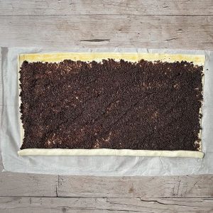 - Den Blätterteig ausrollen und gleichmäßig mit dem Backmohn bis zum Rand bestreichen. Lasse an einer langen Seite einen Rand von ca. 1-2 cm frei.