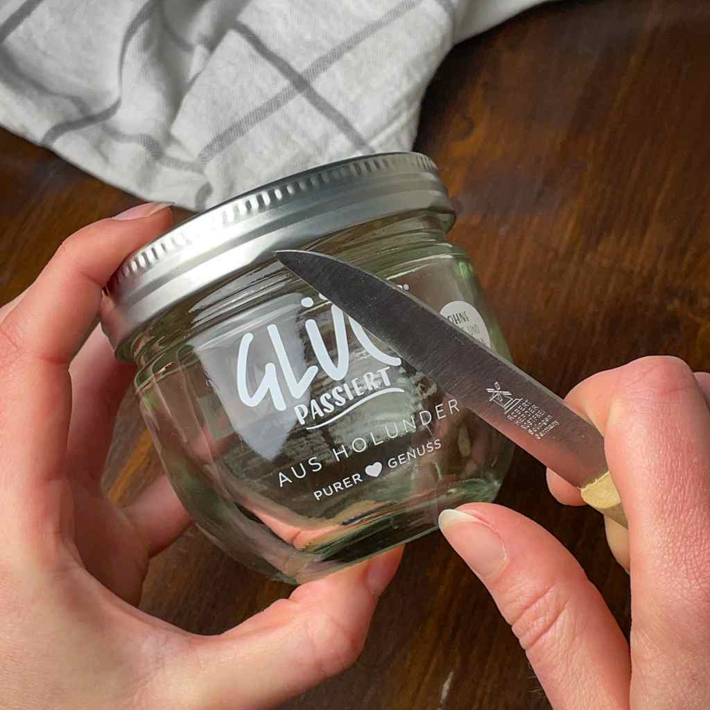 1. Der erste Schritt ist, die Schrift die wir nicht haben wollen, auf unserem Glücksglas zu entfernen. Das geht am einfachsten mit einem handelsüblichen kleinen Küchenmesser. Kratze einfach die Schrift vom Glas und versuche, alles rückstandslos zu entfernen. Alternativ kannst du auch Essigessenz oder einen Herdschaber verwenden, aber aus meiner Erfahrung lässt es sich mit einem Küchenmesser präziser arbeiten.