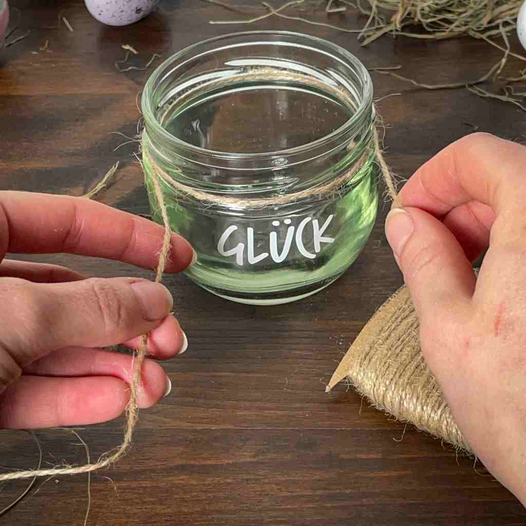 2. Nimm nun das Ende des Jutebandes und halte es mit der linken Hand fest, während du mit der rechten Hand das Band straff um das Glas wickelst. Wickel ruhig ein paar Mal herum, damit das Glas gut bedeckt ist und keine großen Lücken mehr sichtbar sind.