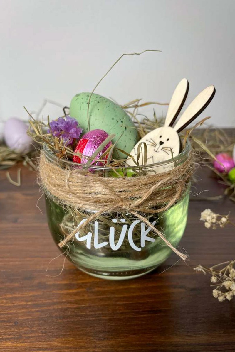 Verschenke dieses kleine, süße Glas als Aufmerksamkeit oder verwende es als Tischdeko an Ostern. Fülle es mit ein paar Snacks und Leckereien und bereite so deiner Familie und deinen Freunden zu Ostern eine kleine Freude.