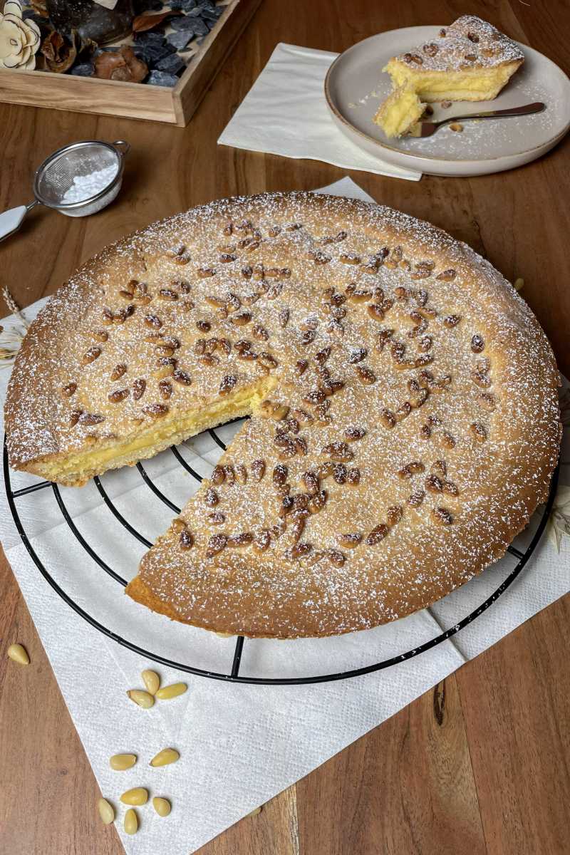 Eine Kombination aus zartem Mürbeteig, gefüllt mit einer frischen Vanille-Puddingcreme, gekrönt mit Pinienkerne und Puderzucker. Entdecke den Klassiker: „Kuchen der Großmutter“ aus Italien.