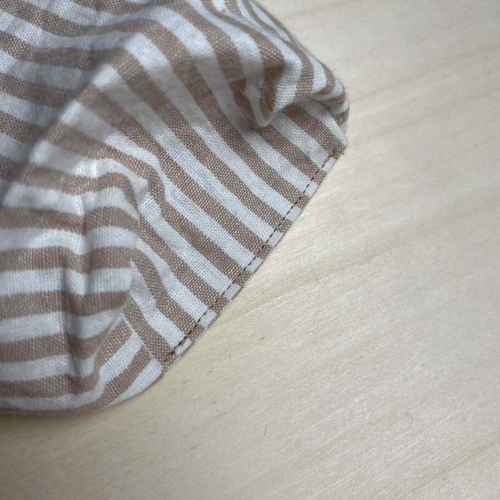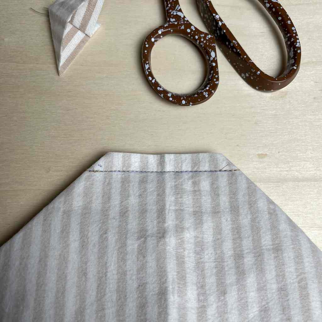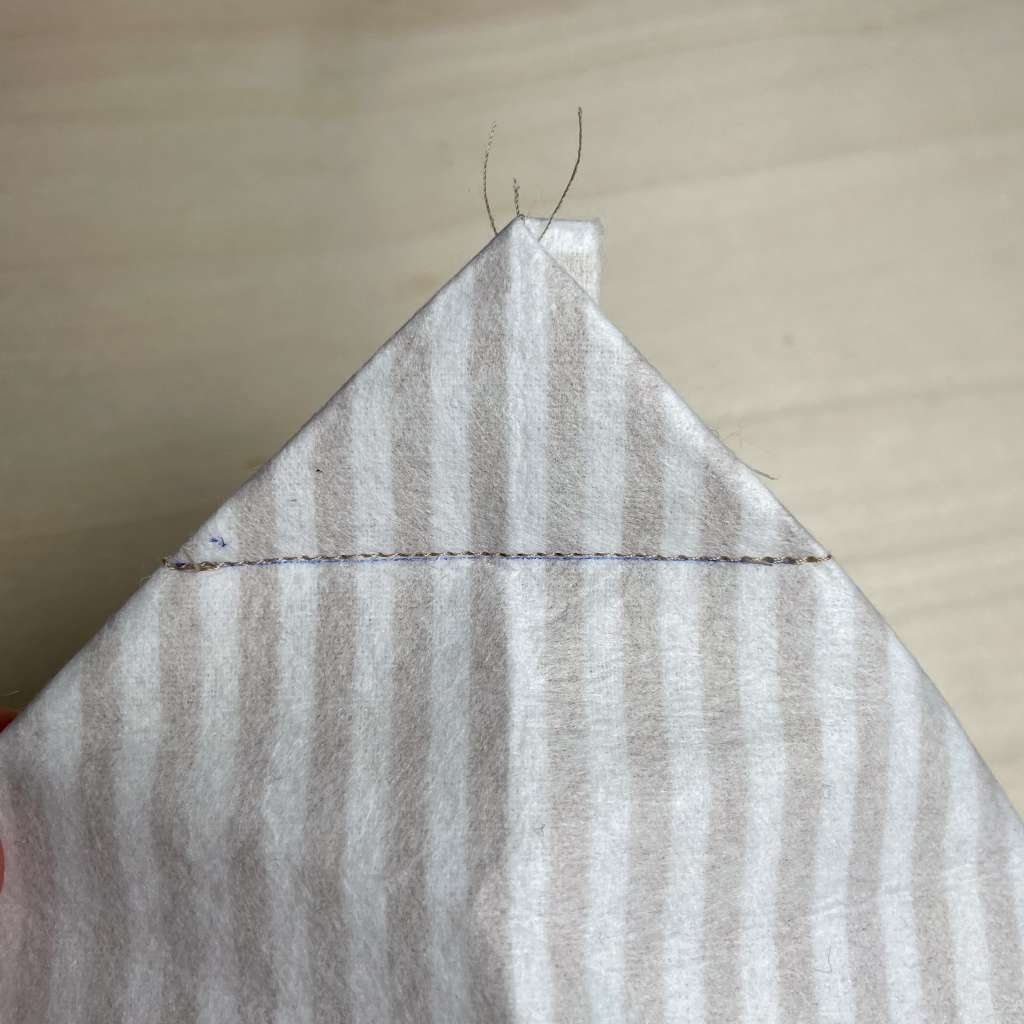 6. Nähe nun über alle vier Ecken mit einem Geradstich. Achte darauf, dass du wirklich über die gesamte Ecke und über den Stoff drüber nähst und die Enden gut versiegelst. Schneide anschließend den überstehenden Stoff ab.