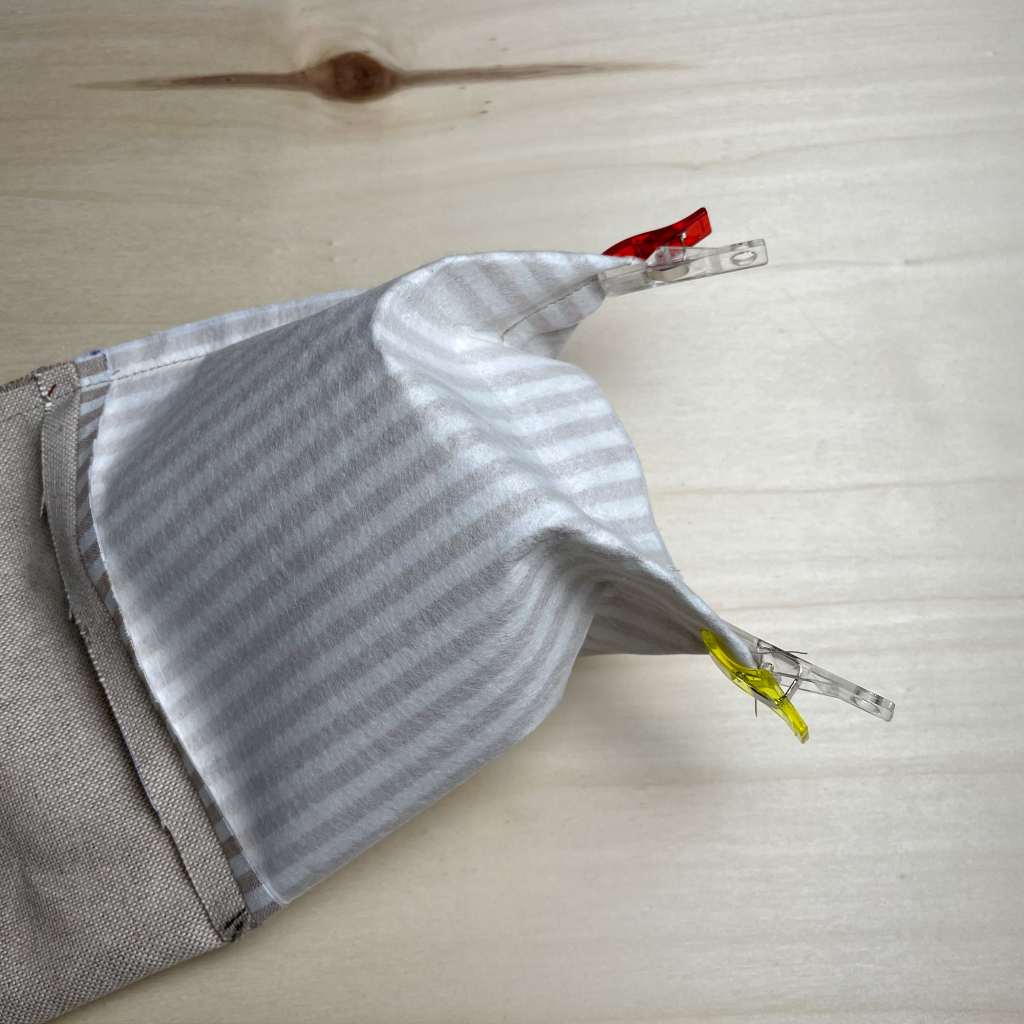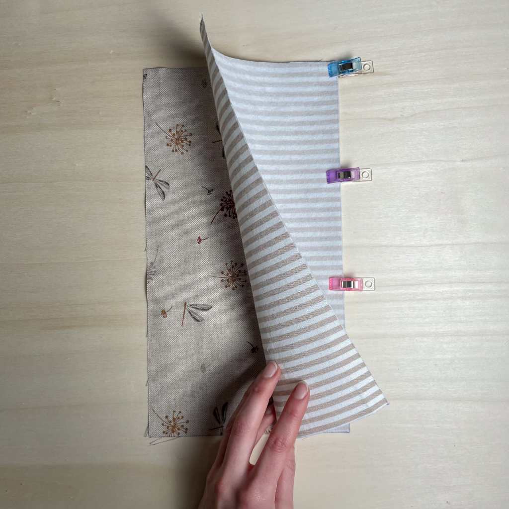 4. Jetzt klappe den Stoff rechts auf rechts zusammen, sodass die Naht aufeinanderliegt. Du kannst dir wieder Clips zur Hilfe nehmen, um alles gut zu fixieren.