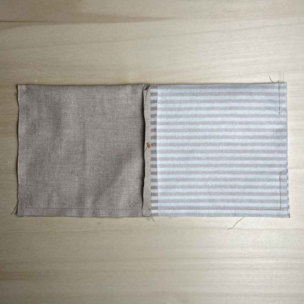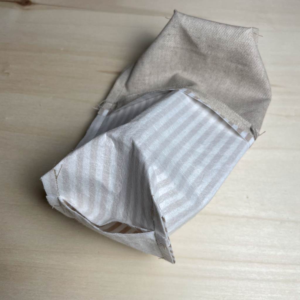 5. Um dem Utensilo jetzt noch einen schönen Stand zu verleihen, nähen wir alle Ecken ab, um einen Boden zu kreieren. Dafür ziehe mittig an beiden Stoffteilen und forme deine Ecken aus. Achte darauf, dass alles ordentlich und mittig zentriert ist und der Abstand rechts und links gleich ist.