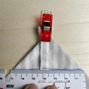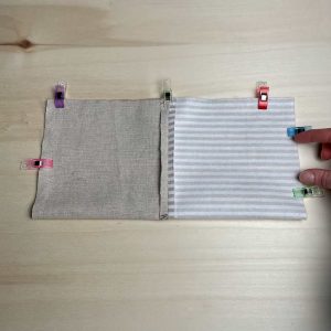 - Klappe nun das Stoffteil rechts auf rechts zusammen, sodass die gebügelte Naht nun exakt aufeinanderliegt. Mit Clips fixieren.